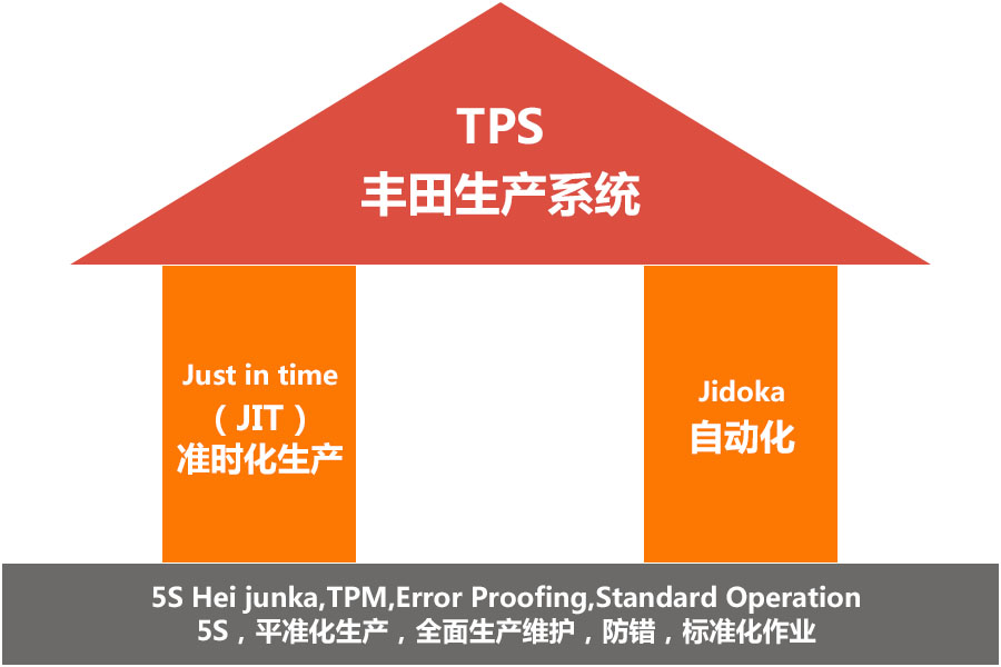本质上说,精益生产的卓越贡献通过消除企业中的浪费而成就,这也是丰田生产系统(TPS)的精髓所在。消除浪费同时确保质量和交货期的思想,通过TPS的两大支柱得到落实于价值链的每一个环节,这两大支柱就是准时化生产(Just In Time)和自动化(Jidoka),它们也被视为精益生产的架构基础。与这两大支柱相关的各种管理方法和工具,其关系常常被图例中的“屋”进行解释和展现。